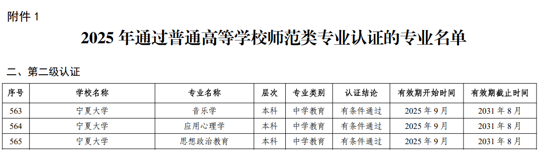 【寧夏大學新聞中心訊 本科生院】近日,教育部辦公廳發布《關于公布2025年通過普通高等學校師范類專業認證專業名單及中期審核專業名單的通知》(教師廳函〔2025〕18號)。我校音樂學、應用心理學、思想政治教育等3個專業通過師范類專業第二級認證,有效期六年;數學與應用數學、漢語言文學、小學教育等3個專業通過師范類專業認證中期審核,繼續保持原認證有效期。截至目前,我校14個師范專業已全部通過師范類專業第二級認證,標志著我校師范人才培養體系質量建設取得重要階段性成果。