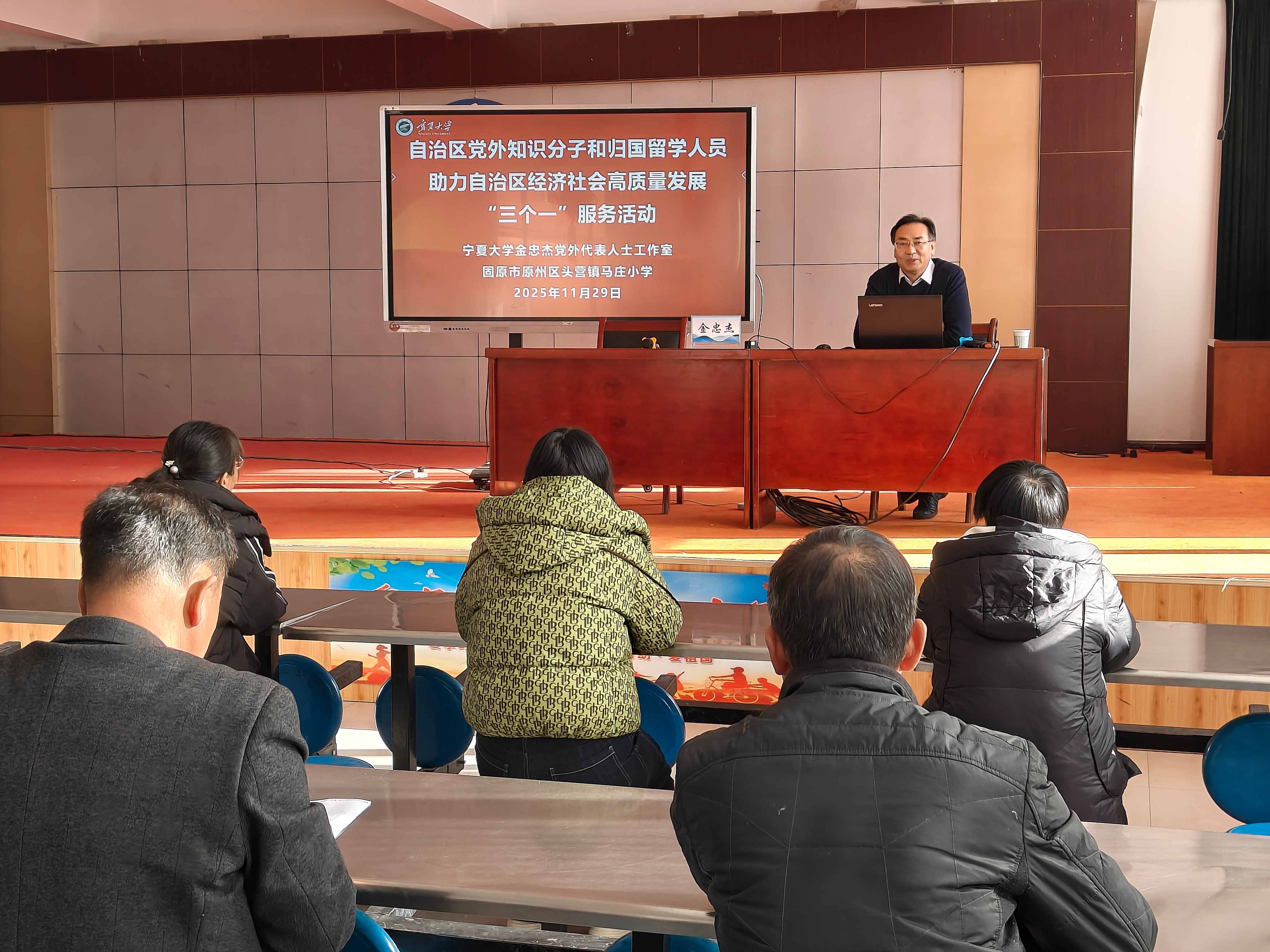 工作會前,寧夏大學金忠杰黨外代表人士工作室在馬莊小學舉行了自治區黨外知識分子和歸國留學人員助力自治區經濟社會高質量發展“三個一”服務活動。自治區政協常委、寧夏大學外國語學院副院長金忠杰教授圍繞“鑄牢中華民族共同體意識示范區建設與新時代中國式現代化寧夏篇章”,為頭營鎮部分學校教師作了專題講座。