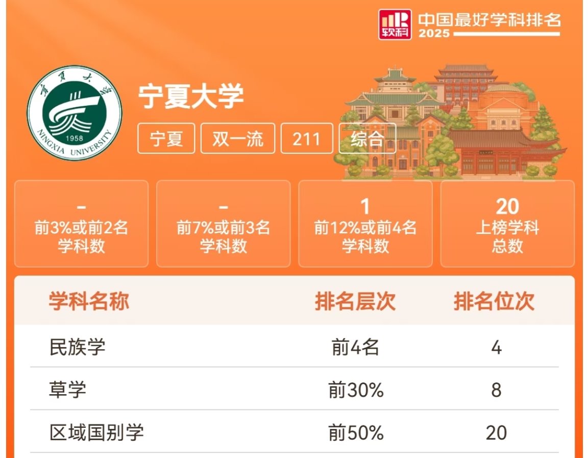 【寧夏大學新聞中心訊 發展規劃與學科建設處】近日,高等教育評價專業機構軟科發布2025年中國最好學科排名,寧夏大學共有民族學、教育學、生物學、機械工程等20個學科上榜,較2021年增加10個學科,實現學科建設質量與規模同步提升。其中,民族學穩居前4名,化學工程與技術位次較2021年提升了29位,草學、區域國別學、園藝學、音樂、美術與書法等學科首次躋身榜單,進步幅度明顯。“十四五”以來,學校堅持“聚焦重點、特色發展、創新機制”原則,深入實施一流學科攻堅行動,探索以需求為導向的學科建設新機制,構建“面向大需求、凝練大方向、組建大團隊、構建大平臺、承擔大項目、產出大成果、實現大轉化”的一體化學科建設路徑,努力實現高峰學科一流突圍、高原學科特色凸顯、交叉學科創新培優、基礎學科強基固本,學科整體實力得到顯著提升。截至目前,一級學科博士學位授權點總量增至12個,一級學科碩士學位授權點總量增至33個,專業學位碩士點總量增至2...